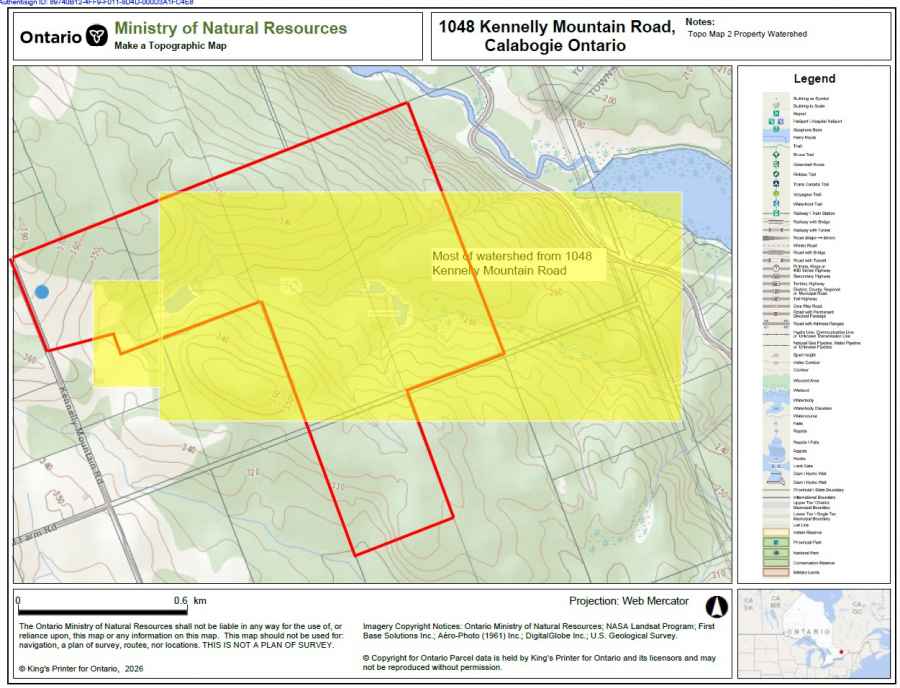 1048 Kennelly Mountain Road features this 346 acre breathtaking forested property with a view over the mighty Madawaska River at Ferguson Lake and Calabogie Lake in the Township of Greater Madawaska. The Gatineau Hills can be visible across the Ottawa River Valley. Calabogie is about 10 minutes away for eateries, skiing, cottaging, speedway racing, and all the Calabogie area has to offer. Ottawa is about 1.5 hours to travel, Renfrew/Arnprior about 45 minutes. Property has 3 tax bills and is zoned Farm & RU. 1048 has about 1281 feet of frontage on gravel road KMR, hydro at road, no septic and no well, telephone available, decent cell service. Cleared land of about 20 acres currently being hayed and also has a year round creek with seasonal ponds allow the area watershed to get to the Madawaska River: about 3 km of trails on property. Watch for more photos & drone video in a few days. Despite its natural seclusion, you're only a 10 minute drive to Calabogie and about 30 minutes to Highway 17/417 making it an ideal blend of tranquility and convenience. Whether you're looking to build your dream home, establish a weekend retreat, or simply invest in a truly special piece of land, this property offers the peace, space, and beauty you've been searching for. Nature at its best quiet, private, and full of potential. Don't miss the opportunity to own this beautiful property - book your showing today!